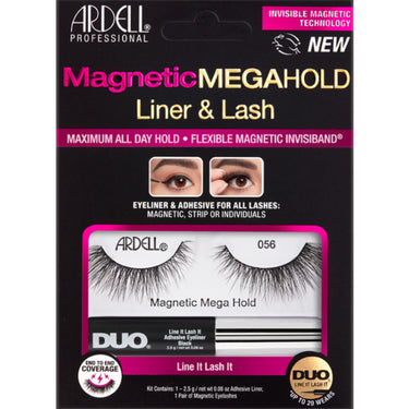 Ardell Mega Hold Magnetic Liner & Lash #056. Bulky magnets are gone! Patented techology creates an unde- tectable magnet band end-to-end for ultra hold. Soft magnet can be trimmed for optimal fit for all shapes with no sharp magnetic pieces poking your lash line. Kit includes newand improved 2.5 gram DUO Line It Lash It; a new formulation that works with alltypes of lashes whether magnetic or not.