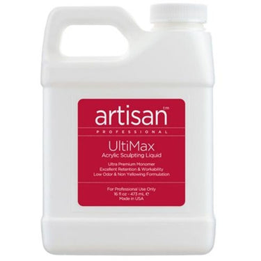 Artisan Ultimax Acrylic Nail Liquid / 16 oz. by Artisan. Premium quality, superior adhesion, very low odor and very easy to work with. Artisan UltiMax Acrylic Liquid is highly adaptable for any nail tech experience level. Teamed up with Artisan Acrylic Nail Powder, the self-leveling feature of the system makes it a breeze to sculpt, meaning minimal stroking and filing on your end. UltiMax Acrylic Liquid is nonyellowing, lift resistant and contains no MMA. Start producing flawless consistency and superior adhesion that lasts more than two weeks.