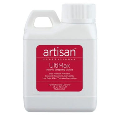 Artisan Ultimax Acrylic Nail Liquid / 4 oz. by Artisan. Premium quality, superior adhesion, very low odor and very easy to work with. Artisan UltiMax Acrylic Liquid is highly adaptable for any nail tech experience level. Teamed up with Artisan Acrylic Nail Powder, the self-leveling feature of the system makes it a breeze to sculpt, meaning minimal stroking and filing on your end. UltiMax Acrylic Liquid is nonyellowing, lift resistant and contains no MMA. Start producing flawless consistency and superior adhesion that lasts more than two weeks.