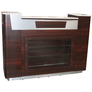Asher Reception Desk / Dark Wood with Stainless Accents and Glass Display. The Asher Reception Desk with Glass Display is a beautiful addition to your nail salon, hair salon, spa, med spa, or tanning salon! With modern stainless accents and a beautiful white and grey speckled marble, this desk will keep your salon organized and looking great!