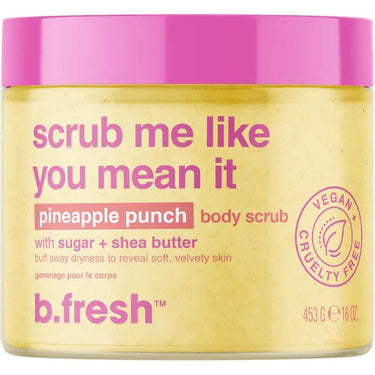 B.Fresh Pineapple Punch Body Scrub Deep Exfoliation & Hydration. Transform your skincare routine with a body scrub that doesnt just cleanse but elevates your skin to new levels of softness and radiance. The B.Fresh Pineapple Punch Body Scrub is designed for professionals who demand resultsoffering a luxurious exfoliation experience that deeply nourishes while revealing silky, glowing skin. Infused with skin-loving ingredients like sugar and shea butter, this invigorating scrub buffs away dryness and impurities, leaving behind a refreshing tropical aroma. Vegan, cruelty-free, and free from harsh chemicals, it's the perfect choice for spas and salons looking to offer high-end exfoliation treatments.