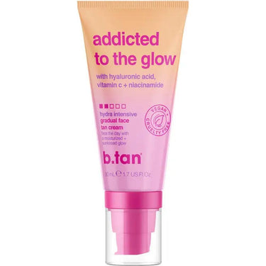 B.Tan Addicted to Glow Face Tan Cream 1.7 oz. Experience the perfect balance of hydration and a radiant sun-kissed glow with the B.Tan Addicted to Glow Face Tan Cream. Designed for beauty professionals and clients alike, this gradual tan cream offers an effortless way to achieve a flawless, glowing complexion. Its lightweight, nourishing formula is packed with skin-loving ingredients that hydrate while giving your skin a natural tan. Ideal for daily use, this product ensures a gradual, buildable glow without the harsh chemicals often found in other tanning products.
