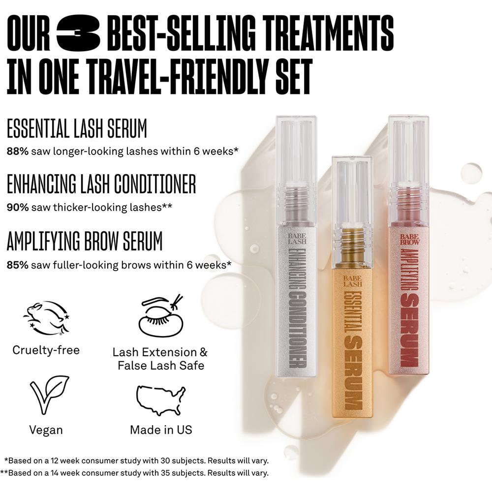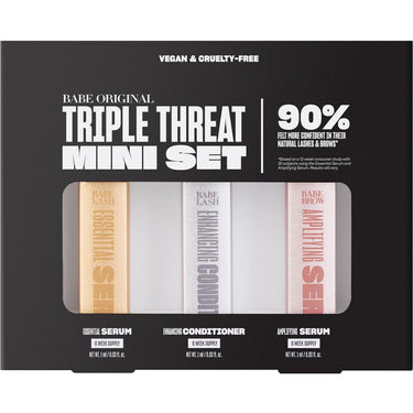 Babe Lash Triple Threat Mini Set: A Pro-Approved Brow & Lash Boost. Deliver visible results that keep clients coming back. The Babe Lash Triple Threat Mini Set is your salons go-to solution for enhancing lashes and brows with clinical-strength formulas, all packaged in a retail-ready set your clients will love. This sleek trio is designed to jumpstart visible improvements in just 4 to 12 weeksideal for clients seeking fuller brows and longer, healthier-looking lashes without extensions or invasive treatments.