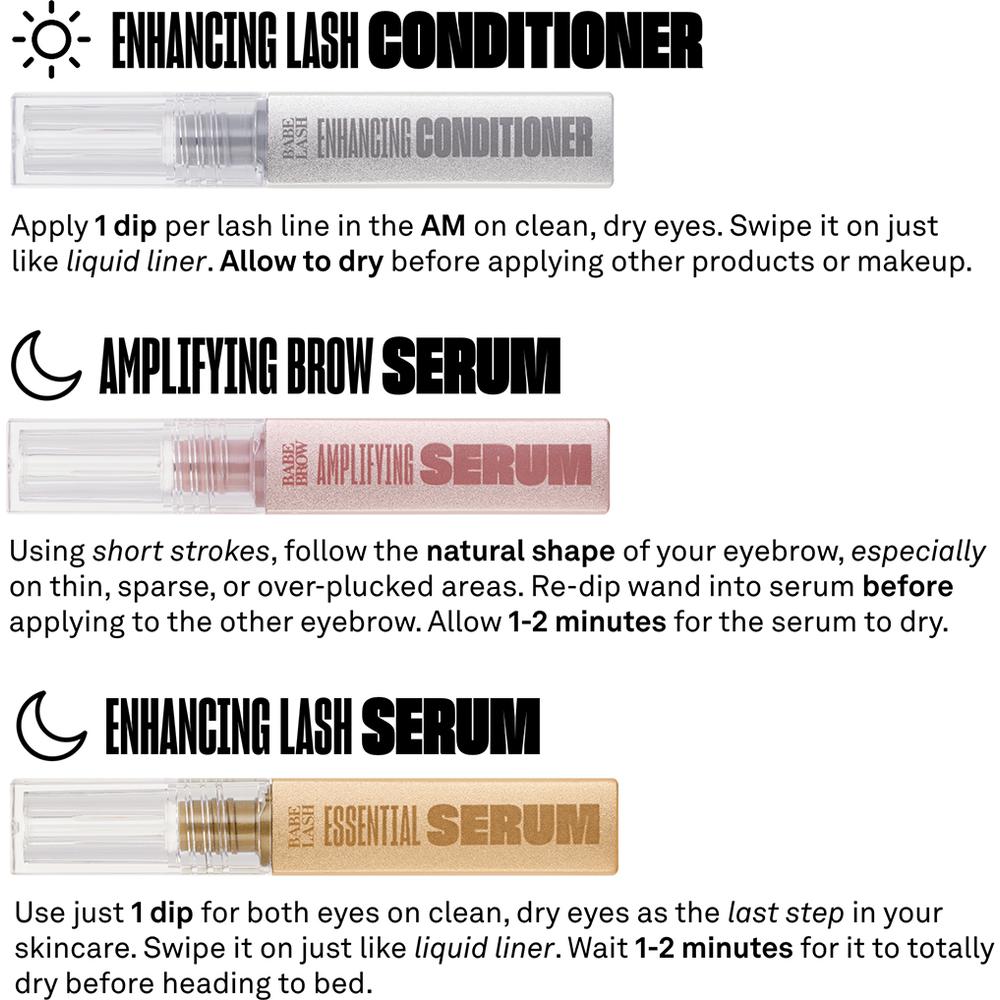 - Amplifying Brow Serum: Apply at night to clean brows, focusing on sparse areas. One dip per brow. Let dry before layering skincare.