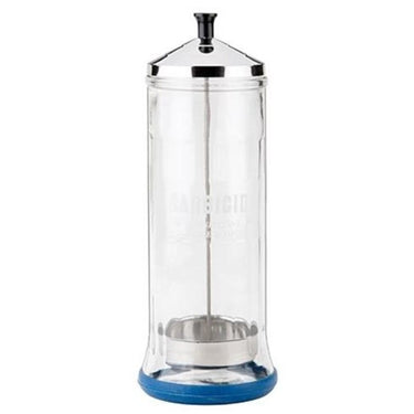 Barbicide Disinfectant Jar / 37 oz. by King Research. Have one at every station where clients can see you sanitize! Available in 3 sizes to accommodate all implements. Place one at every station where customers can see that you sanitize your implements. Stainless steel basket allows for drainage and easy removal of implements. Rubber ring is placed on the bottom to eliminate slippage.