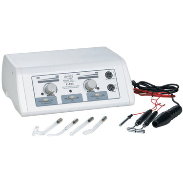 High Frequency instrument is to speed up the circulation of the blood, stimulate glandular activity, remove bacteria and ease the penetration of cosmetic products. It uses high frequency to kill bacteria on the skins surface and aid in product penetration. Includes base unit, high frequency handle, acne electrode, spoon electrode, mushroom electrode, and indirect electrode.