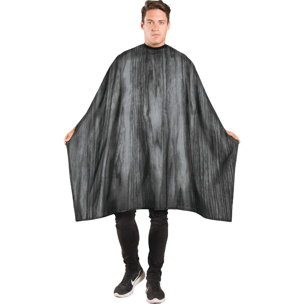 Wood Grain Styling Cape. The Wood Grain Styling Cape is where modern style meets professional functionality, designed to enhance your salon's aesthetic while providing ultimate practicality. Crafted with lightweight, water-resistant polyester, this cape features a sleek gray wood grain effect with refined black trim, creating an upscale and polished look for your salon or barbering space. Not just about appearances, this cape offers extended back coverage and full protection during haircuts and styling sessions, ensuring your clients stay comfortable and clean.