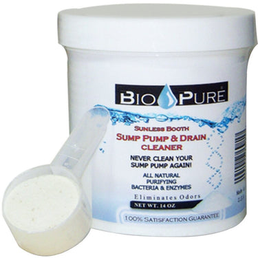Bio-Pure All Natural Sunless Booth Sump Pump & Drain Cleaner / 14 oz. Bio-Pure is an all Natural, Dual Action Cleaner that Breaks Down & Digests Organic Waste in Drains, Septic Treatments & Sump Pumps. Prevents drain Backup & Foul Odors, desolves and degrades Heavy Concenations of Organic Matter within the Sump Pump. In 3 Days, improvement in Sump Pump Flow. Listed as FDA GRAS completely safe for Humans, Animals and Plants. 2-3 Hours, Odors will be Gone!