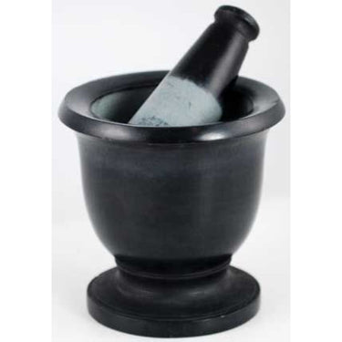 Black Soapstone Mortar and Pestle Set. Carved of soapstone and finished with a black glaze along the outer surface, this wonderful mortar and pestle set is just the perfect size for creating small amounts of your favorite herbal mixture or treatment recipe. This mortar can handily contain most ingredients while the pestle has been shaped to just the right size to fit in the palm of your hand as you work your materials. The mortar measures approximately 3" high and 3" in diameter, and the pestle measures approximately 3" in length.