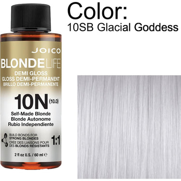 Joico Blonde Life Demi Gloss - 10SB Glacial Goddess. Deliver luminous shine, brass-neutralizing brilliance, and bond-building strength with Joico Blonde Life Demi Gloss—a must-have tool for every blonde expert’s arsenal. Designed to tone, glaze, and gloss in one step, this ammonia-free liquid toner brings together the artistry of customizable blonde tones with the science of bond-repair and conditioning. Whether you’re refining a platinum finish, correcting warmth, or reviving a faded blonde, Blonde Life Demi Gloss offers endless versatility, stunning results, and healthy, radiant hair that leaves clients glowing.