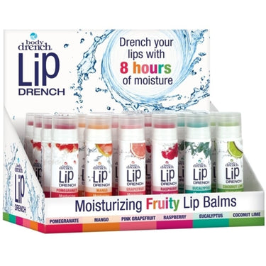 Body Drench Lip Drench Display treats lips to a kiss of fruity flavor. Includes four each of coconut lime, eucalyptus, pink grapefruit, mango, pomegranate and raspberry flavors. 24 count, 0.15 oz. ea.