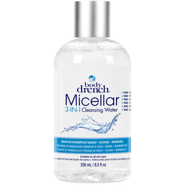 Body Drench - Micellar 3-in-1 Cleansing Water / 8.5 oz. - 250 mL. This 3-in-1 Micellar Cleansing Water will remove waterproof makeup while soothing and refreshing skin. The gentle formula includes micelle molecules that trap and dissolve unwanted particles, leaving skin clean and hydrated. Suitable for all skin types. Contains no fragrance, parabens, oil or alcohol. Directions: Using a cotton pad, gently massage around the face, eye and lip areas until all traces of makeup are removed. MADE IN USA.