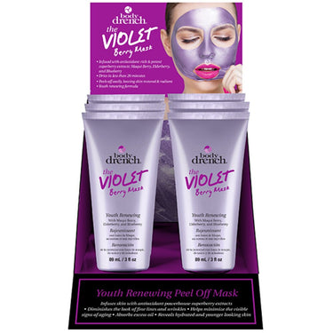 Body Drench The Violet Berry Peel Off Mask / 3 oz. - 6 Piece Display. The antioxidant rich Violet Berry Peel Off Mask gently purifies and rejuvenates the skin. This beautiful violet shimmer formula is infused with potent antioxidants and vitamin-rich superberries, Maqui Berry, Elderberry, and Blueberry, to minimize visible signs of aging and renew supple skin. The smooth peel off removal technique also helps draw out excess dirt and oil on the skins surface, leaving the skin renewed and radiant.