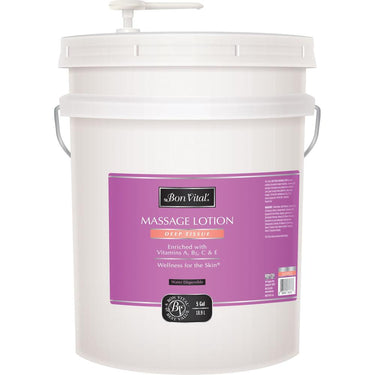Bon Vital Deep Tissue Massage Lotion - Original / 5 Gallons. Bon Vital' Original Deep Tissue Lotion has been specifically formulated for deeper modalities. A smooth glide and texture, that absorbs more quickly than our Swedish Lotion, and gives it enough friction perfect for a deep tissue massage. Enriched with multi-vitamins (A, B5, C & E). Leaves no greasy feel! Unscented. Available in 8 oz bottle with pump, 1 gallon container, or 5 gallon pail.