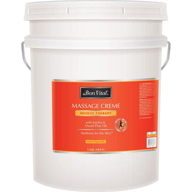 Bon Vital Muscle Therapy Creme - 5 Gallons. This wonderfully smooth creme is tough on muscle aches while providing a lasting glide and ultimate control for the therapist. Muscle Therapy Creme penetrates deep within the layers of skin and gives a clean absorption. Perfect for sports massage, deep tissue, neuromuscular and trigger point modalities. No Nut Oils. Paraben Free.