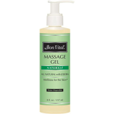 Bon Vital Naturale Massage Gel / 8 oz. Bon Vital' Naturale Massage Gel uses 100% all-natural organic ingredients enriched with sea algae, japanese green tea, and hops extracts. Developed to be a very light formula that absorbs like a lotion and has a lasting glide that leaves the skin silky smooth; Bon Vital Naturale Massage Gel is a natural economical choice. The lasting glide outperforms cremes, lotions, and oils so you will use less per application. Completely water dispersible for easy cleanup of linens and fabrics. Available in 8 oz bottle with pump, 1 gallon container, or 5 gallon container. Unscented.