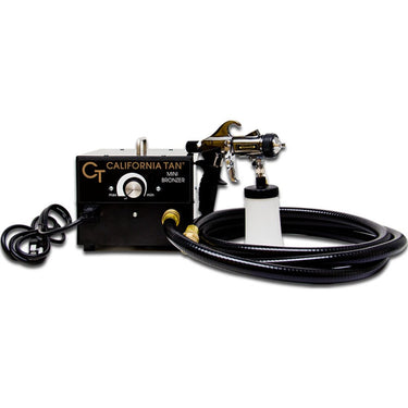 California Tan - Mini Bronzer HVLP Spray Unit. The Mini Bronzer is a lightweight, compact, and portable sunless tanning spray unit that is perfect for on-the-go spray technicians. While weighing less than 12 lbs., this unit is designed for durability and convenience. All metal design. Same quality gun as the mobile bronzer. Quick connect coupling hose on both ends. Full 2 year warranty from Cal Tan.
