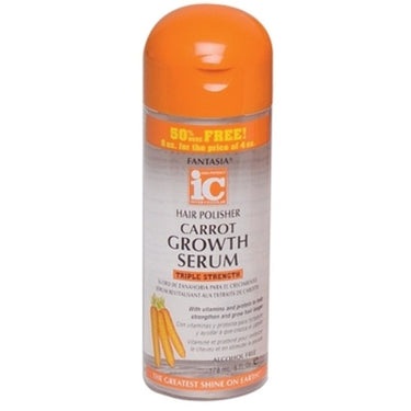 Carrot Growth Serum / 6 oz. Triple strength formula conditions, strengthens and adds shine to weak, damaged hair. Hair grows stronger and longer from root to end. Protects the hair from heat damage caused hair tools. Perfect for all hair types.