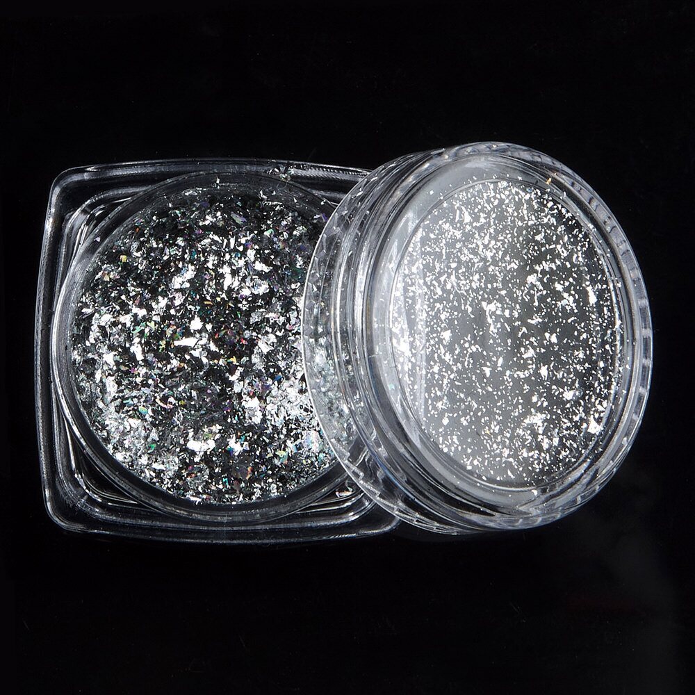 - Iridescent Holographic Particles: Iridescent prismatic gray flakes dance on the nail and diffuse the gray tones into rainbow of vivid colors.