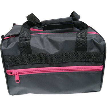 City Lights Cosmetic Bag. Black cosmetic bag with fun, stylish pink zipper accents. Features a sturdy bottom insert, and 4 mesh pockets - two on each side of the tote. The outside has a front zippered pouch for extra storage. Measures: 10"W X 7"H X 7"D