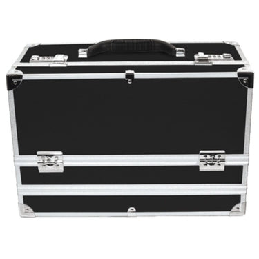 City Lights Lockable Aluminum Case. Top section of case is lockable and has 3 folding trays (6-1/2"x 14-1/2"), a center storage compartment and a rubberized carrying handle. Bottom section of case detatches revealing an extra storage tray that measures 7-1/4" x 15-1/4".