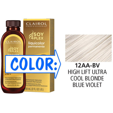 Clairol Professional Liquicolor Permanente - 12AA-BV High Lift Ultra Cool Blonde Blue-Violet / 2 oz. A permanent liquid color available in 64 shades, ideal for quick application and coloring in between foils. Use for deep conditioning gray coverage, with 84% more conditioning than the leading professional cream. For even more conditioning, mix with Clairol Professional Color Serum.