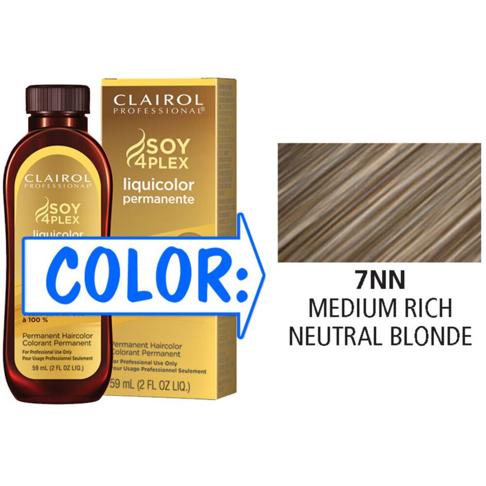 Clairol Professional Liquicolor Permanente - 7NN Medium Rich Neutral Blonde / 2 oz. A permanent liquid color available in 64 shades, ideal for quick application and coloring in between foils. Use for deep conditioning gray coverage, with 84% more conditioning than the leading professional cream. For even more conditioning, mix with Clairol Professional Color Serum.