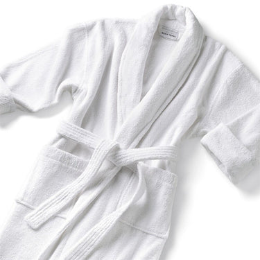Classic Shawl Collar Robe - Velour 100% Cotton - 16 oz. / White. A timeless classic, the shawl collar robe is the most familiar and comforting design. Terry bathrobes date from the Victorian era, when cloth as soft and absorbent as terry was both expensive and difficult to manufacture. After completing a bath, the lady or gentleman donned a plush robe instead of drying off with a towel. The rolled collar and cuffs add just a bit of flair. Pockets offer plenty of space for your book, a bottle of lotion or an aromatherapy mask.