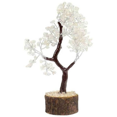 Clear Quartz Gemstone Tree. The clear quartz gemstone tree is a beautiful and powerful presentation all by itself. Base has felt bottom and measures 1 3/4" wide. Overall height 5". Gems are approximately 1/4". Sizes to vary.
