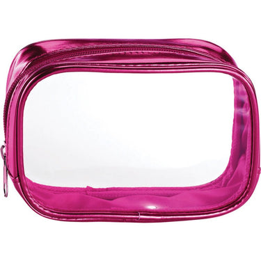 Clear Sided Metallic Cosmetic Bag - Pink - 6" x 2" x 3" / Pack of 24. Perfect for promotional giveaways or for retail sale, this Pink cosmetic bag with a shiny metallic trim and zipper closure is just the right size to carry an assortment of makeup essentials. The clear PVC material makes it easy to see the enclosed contents and the small size is perfect for travel.