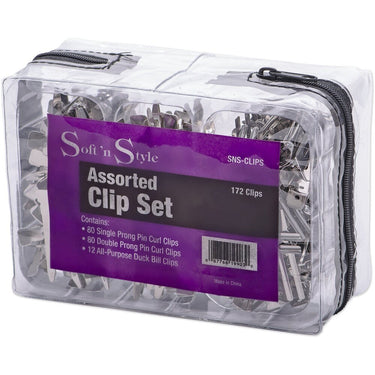 Clip & Pin Set - 172 Pieces. Assorted Clip Set. Contains: 80 Single prong pin curl clips, 80 double prong pin curl clips, 12 all-purpose duck bill clips and a deluxe travel bag.