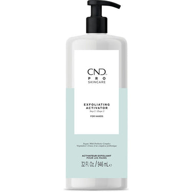 CND Pro Skincare - Exfoliating Activator - Step 2 / 32 fl. oz. - 946 mL. CND™ PRO SKINCARE EXFOLIATING ACTIVATOR (For Hands). This activator is Step 2 of a reinvigorating prebiotic complex-enriched waterless hand exfoliation system. It activates and dissolves exfoliating crystals for radiant, healthier-looking skin. Use after CND Pro Skincare Exfoliating Hand Scrub, Step 1 (CND1040). Formulated with soothing aloe leaf. Light cucumber scent. Bottle made of 100% post-consumer recycled (PCR) materials.