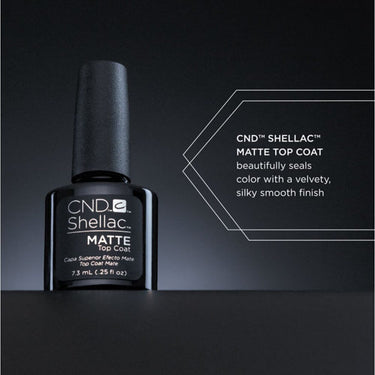 CND Shellac Special Effect Top Coat - Matte Top Coat / 0.25 oz. CND SHELLAC Special Effect Top Coat: Matte. This top coat offers a velvety textured finish to any SHELLAC Color Coat shade. CND SHELLAC was designed to be used as a system. Featuring a Base Coat, Color Coat, and Top Coat - together with the exclusive CND SHELLAC Lamp - CND delivers on its promise of two week wear, when used as a complete nail system.