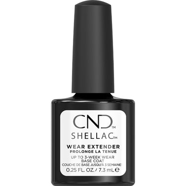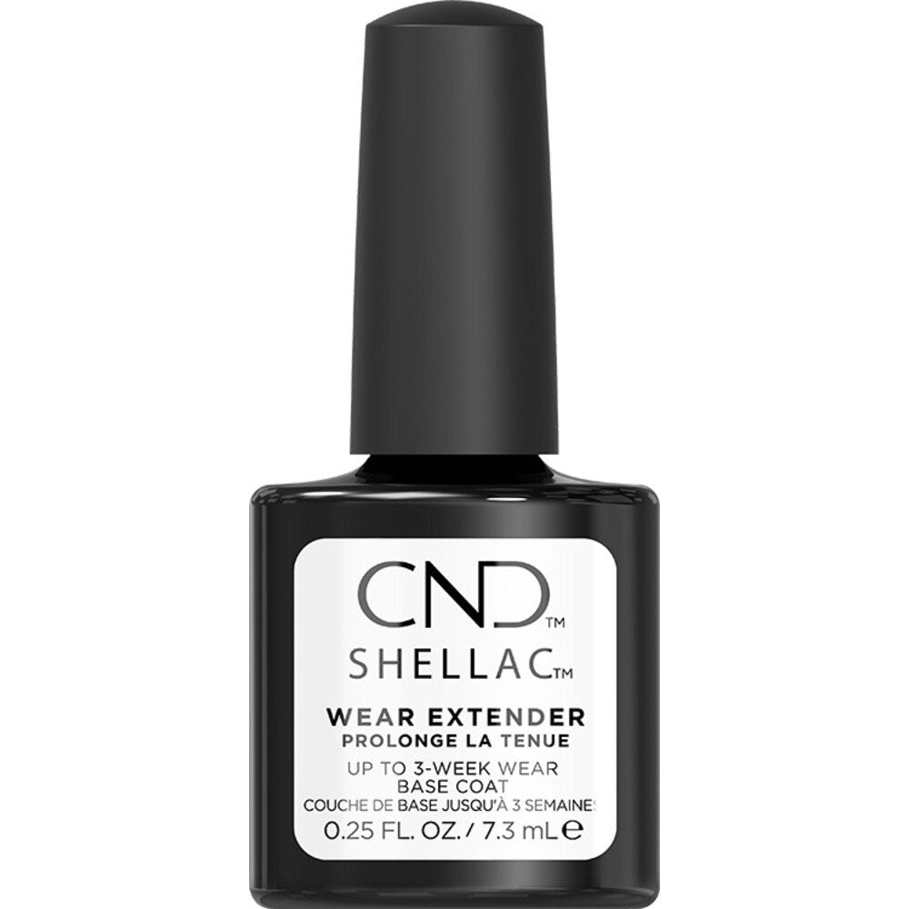 CND Shellac Wear Extender Base Coat / 0.25 fl. oz. - 7.3 mL. CND Shellac Wear Extender Base Coat includes a new superior curve hugging brush for premium performance! 200+ Bristles that adapt to the nail for better coverage. Each filament has a solid, round section that helps provide a smooth and even application for full coverage and better color application.