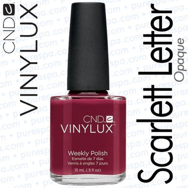 CND VINYLUX Scarlett Letter / 0.5 oz. CND VINYLUX Scarlett Letter / 0.5 oz. VINYLUX is a two-step polish system consisting of VINYLUX Weekly Polish (featuring a built-in basecoat) and VINYLUX Weekly Top Coat that offers durable, high-shine and week-long wear. The top coat becomes more durable when exposed to natural light, ensuring no chipping or scratching for at least one week. VINYLUX dries in just eight and a half minutes. Plus VINYLUX colors perfectly match CND Shellac™ shades, making for easy CND Shellac touchups on the go and for pedicures that perfectly match CND Shellac manicures.