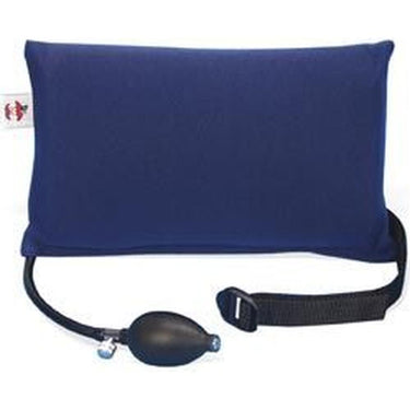 Adjust the level of support with the squeeze of the hand pump. A durable air bladder encased in a breathable foam pad cover for comfort. Straps easily to any chair for proper positioning (positioning belt included). Blue cover. 7" x 11" (18cm x 28cm)