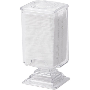 Cotton Dispenser With 50 Cotton Squares. Clear plastic square cotton pad dispenser with bottom opening includes 50 white cotton squares. Top lid allows for easy refills. Cotton pads measure 2-1 /8" x 2-1/2" Measures: 6"H x 2-3/4"W x 2-3/8"D