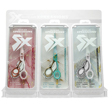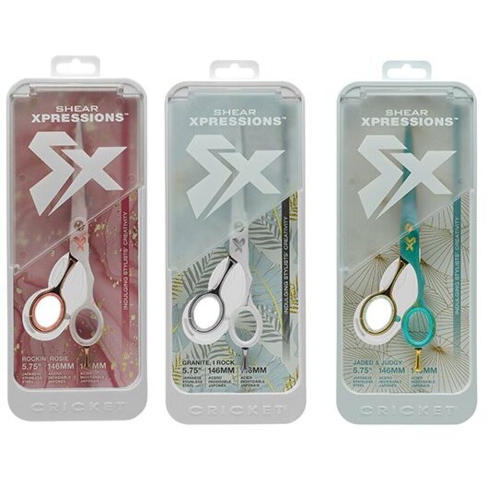 Cricket Shear Xpressions 5.75" / Simply Marblelous Collection / 6 Piece Display. Cricket Shear Xpressions Simply Marblelous Collection - A rich marble pattern is featured prominently on the front of the shear, with a highly polished, coordinating chrome finish on the back. Each shear takes hints from fashion while staying true to what focused stylists require when creating/cutting hair.