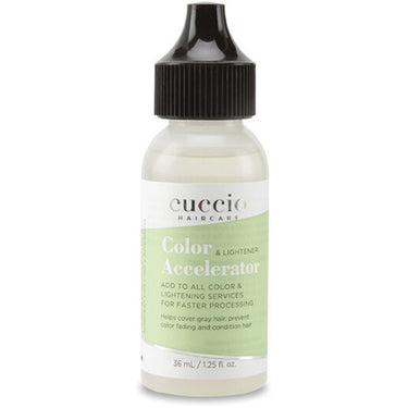 Cuccio Haircare Color & Lightener Accelerator / 1.25 oz. Cuccio Haircare Color and Lightening Accelerator is a treatment additive that cuts color processing time in half. It prolongs hair color fading, helps with gray coverage and overall condition of the hair. Can be used with any manufacturers 10 to 60 volume developer, including creme for semi, demi, permanent colors and lighteners such as foils, high lifts and on the scalp services.