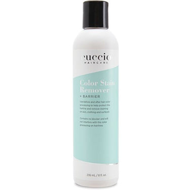 Cuccio Haircare Color Stain Remover / 8 oz. Cuccio Haircare Color Stain Remover is an advanced dual purpose formula. Use before applying hair color to protect the skin, scalp or hairline from staining. After color, use to remove excess color from skin, clothing, equipment, work surfaces or embedded in nail cuticles. It does not interfere with color process.