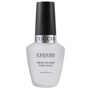 Cuccio High Gloss Top Coat / 0.34 oz. Cuccio High Gloss Top Coat contains UV absorbers to protect the color with a high gloss, chip resistant and quick dry formula. Nail Solutions are designed to meet specific needs of every type of nail client or use as maintenance after salon/spa care to grow longer, stronger, healthy natural nails. .34 oz.