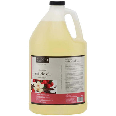 Cuccio Revitalizing Cuticle Oil - VANILLA BERRY / 1 Gallon - 3.78 Liters. These Cuccio manicure oils nourish the skin and cuticles to keep them soft, smooth, and moisturized. Each deeply penetrating oil provides intense hydration to protect against dryness and imparts a unique, refreshing aroma (except for fragrance-free).