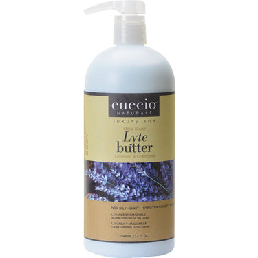 Cuccio Ultra Sheer Non Oily Lyte Butter - Lavender & Chamomile - for Hands, Feet & Body / 32 oz. Cuccio Naturalé Lyte Butter is an ultra sheer cream that provides instant hydration, formulated with time released humectants that moisturize & rejuvenate the skin every two hours. This lightweight moisturizer gives 24-hour support for prolonged, long lasting nourishment to your hands, body, andfeet, leaving your skin soft and silky all day long; even after hand washing! Crafted by beauty professionals & artisans this sheer butter is elaborated with milk to soothe & soften skin to keep parched skin hydrated. This non-oily cream is Paraben & Cruelty Free; elaborated with carefully selectednatural ingredients & plant-based preservatives for a scentual spa experience right from the comfort of your own home. The sheer, lighter side of Cuccio Naturale Butter Blends for instant hydration.