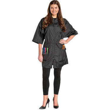 Custom Fit Stylist Jacket with Adjustable Waistline Cord For A Perfect Fit. Black Soft, lightweight stylist jacket in a breathable, polyester/bamboo blend material. Features an adjustable waistline cord for a customized fit, so it looks great on any stylist. The jacket has a front zipper closure and 2 front pockets with zippers to easily remove any stray hairs. Static and water resistant. Machine washable.