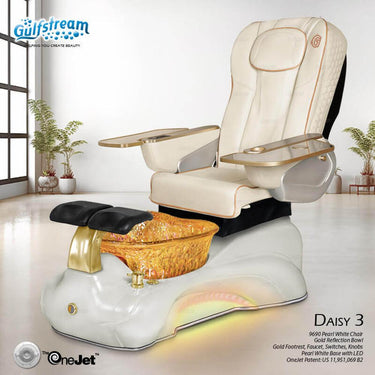 The Daisy 3 Pedicure Spa by Gulfstream combines sleek design, innovative technology, and luxurious comfort to redefine pedicure experiences for both clients and technicians. Its ultra-slim base features a soothing LED glow that enhances the ambiance of any salon or spa. Paired with the high-performance 9690 Massage Chair, complete with gold edging and premium PU leather, the Daisy 3 is designed to deliver a truly indulgent and rejuvenating experience.