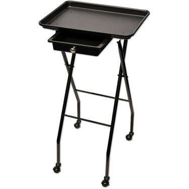 Deluxe Fold-Away Utility Tray. Deluxe Fold-Away Utility Tray. Keep the essentials organized and easy to reach with this convenient, space-saving, utility tray Features: Easy to fold and store Sliding drawer for extra storage when in use .Easy-to-roll swivel wheels . Tray measures: 18" x 13" Drawer measures: 8-1/2"L x 9-1/2 "W x 2"D