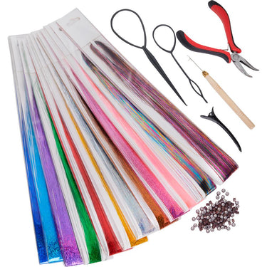 This deluxe set includes not just the tinsel, but all the necessary tools for fast and easy application. With 12 bundles of tinsel in assorted colors, stylists can create a wide variety of vibrant looks. The included pulling hook, two loops (one large and one small), a pair of pliers, a hair clip, and 100 beads provide all the essentials for precise and secure application. The tools make it easy to apply the tinsel extensions smoothly and seamlessly, ensuring a professional finish every time.