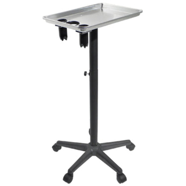 Deluxe Utility Tray with Roller Stand. Deluxe utility tray is perfect for any station. Its sturdy construction makes it easy to roll from place to place. Features 3 heat resistant appliance holders; 1 large 2-3/4"diameters, and 2 small 1-3/4" diameters. The large aluminum top tray keeps items organized. it is also chemical proof and easy to clean.