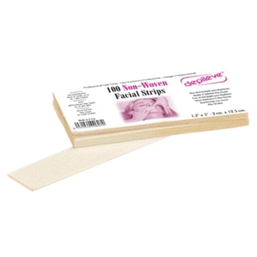 Depileve Non-Woven Facial Strips. Depileve Non-Woven Facial Strips are the perfect choice for professionals looking for a reliable and effective product for facial and small body area waxing. Made of satinated, non-woven material, these pre-cut strips ensure that wax doesn't seep through, providing a mess-free waxing experience. With 100 pieces in each box, you'll have plenty of strips to use on your clients. Measuring 1-1/2" x 5", these strips are the perfect size for facial use or small body area application. They are gentle on the skin, yet effective in removing even the most stubborn hair. Order your box of Depileve Non-Woven Facial Strips today and experience the difference for yourself.