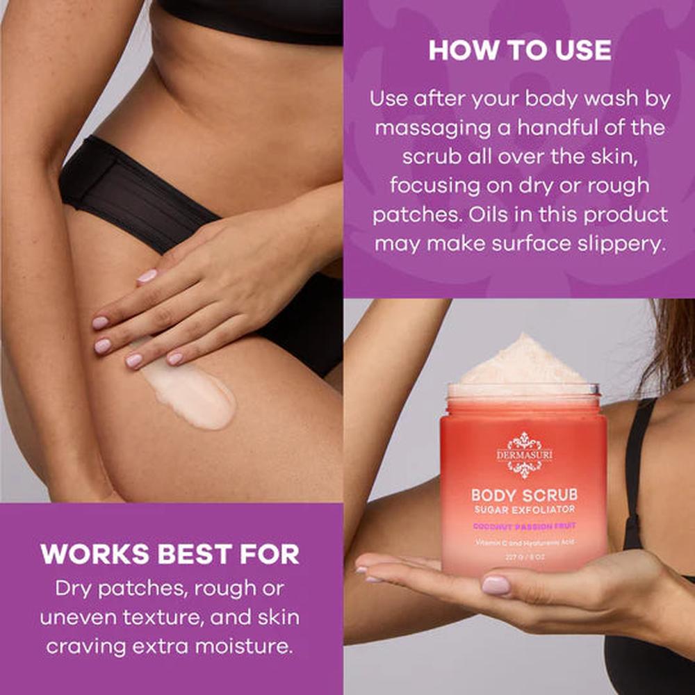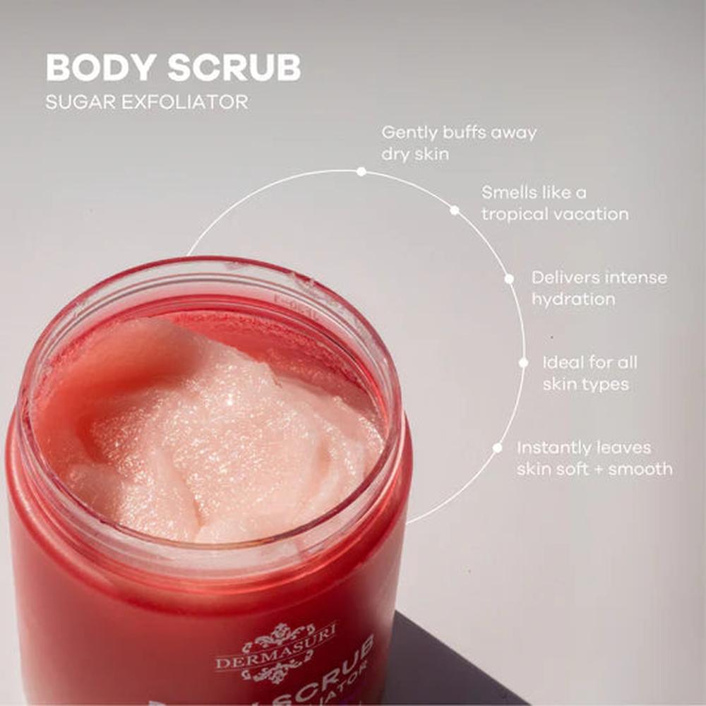 Dermasuri’s Sugar Body Scrub is all about effective exfoliation without the drama. The granules are fine and rounded, so they polish instead of scratch, and the oil-butter base cushions the glide for a truly gentle feel. Regular use reveals a more even look from shoulders to shins, softens the appearance of flaky areas, and helps prevent that “dull” tone that lingers even after moisturizing. Because the sugar dissolves in warm water, the scrub rinses clean—no heavy residue, just a fresh, velvety finish.